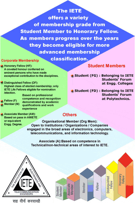 The IETE membership is available at different levels based on the applicants’ academic qualifications and practical experience in electronics, telecommunications, computers, information technology and related areas. Applicants are invited to seek the highest membership grade they are qualified for.